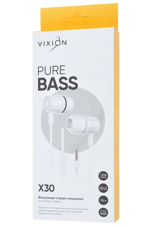 Благодаря технологии PURE BASS басы в наушниках VIXION X30 ярко и четко звучат. Наушники выполнены в высококачественном корпусе, что придает аксессуару надежность и долговечность. Длинный кабель гарантирует удобство в использовании. Высокое качество звука достигается с помощью металлического излучателя, мощного неодимовому магнита и медной оплетки. Универсальная гарнитура проста в эксплуатации.